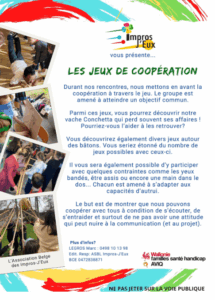 Impros-J'Eux est une ASBL qui depuis 25 ans promeut l'inclusion des personnes en situation de handicap en créant des rencontres authentiques et enrichissantes avec des personnes sans handicap.